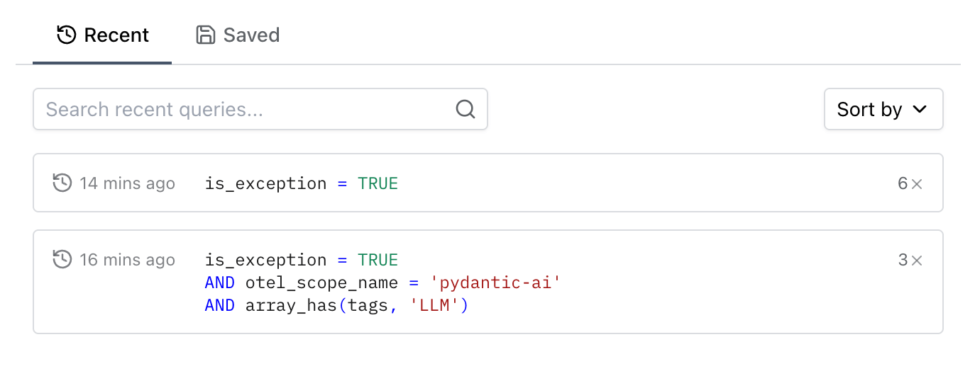 • Use the search fields in both Recent and Saved tabs to quickly find queries by name.